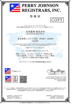 石丸製麺株式会社は、讃岐うどんをはじめとする乾麺、半生麺などの開発、製造、販売の事業活動を通じ、食品安全マネジメントシステムを継続的かつ有効に運用し、安全・安心および、おいしさと品質を追求した食品を提供するために活動します。